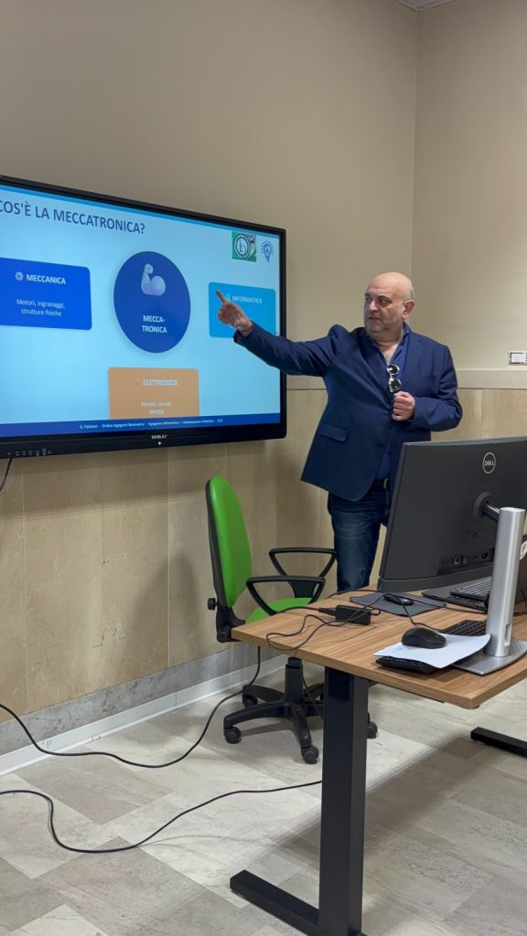 L’Ing. Palmieri ha guidato i ragazzi attraverso i concetti fondamentali della meccatronica — disciplina che integra meccanica, elettronica e informatica — mostrando come queste tre componenti convergano nella progettazione di sistemi intelligenti, robot e dispositivi automatizzati.