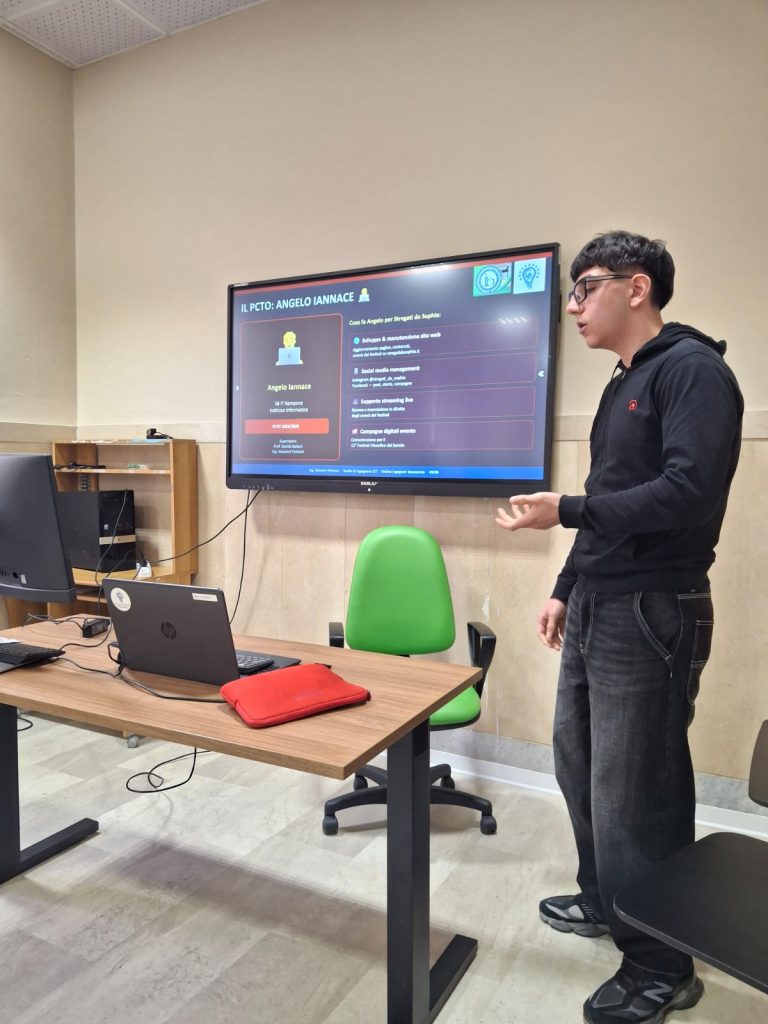 • Angelo Iannace (3B IT Rampone – Indirizzo Informatica) ha illustrato il suo ruolo come sviluppatore web e social media manager per il festival “Stregati da Sophia”, curando il sito web, i canali social e il supporto allo streaming live degli eventi;