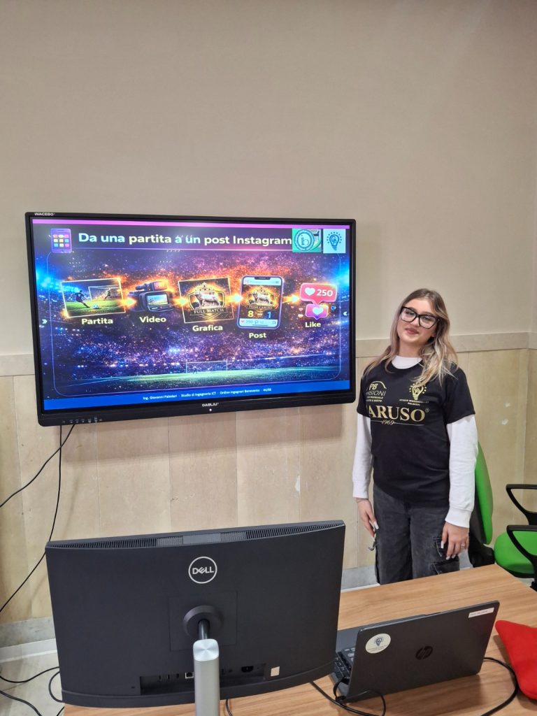 • Federica Ferrara (3D IT Rampone – Indirizzo Grafica e Comunicazione) ha mostrato il processo creativo che trasforma una partita di calcio in un post Instagram virale, attraverso le fasi di video, grafica e storytelling digitale — un esempio concreto di come le competenze digitali si integrino con la comunicazione sportiva.